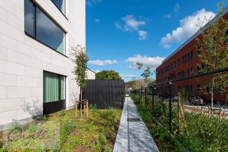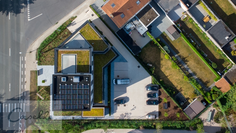 - De gevel, afgewerkt met natuursteen “Gradina”, geeft het gebouw een tijdloze en elegante uitstraling die bijdraagt aan de duurzame waarde van uw investering.
