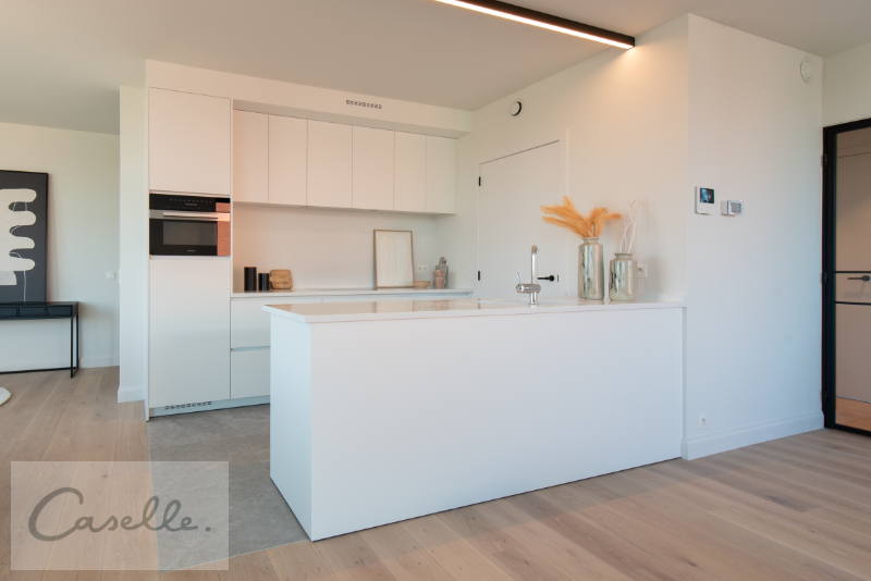 De ruime, lichtrijke leefruimtes met grote raampartijen langs drie zijden creëren een aangenaam en open woongevoel. Een maatwerkkeuken met natuurstenen werkblad, centraal kookeiland en topklasse MIELE-toestellen: een echte blikvanger!